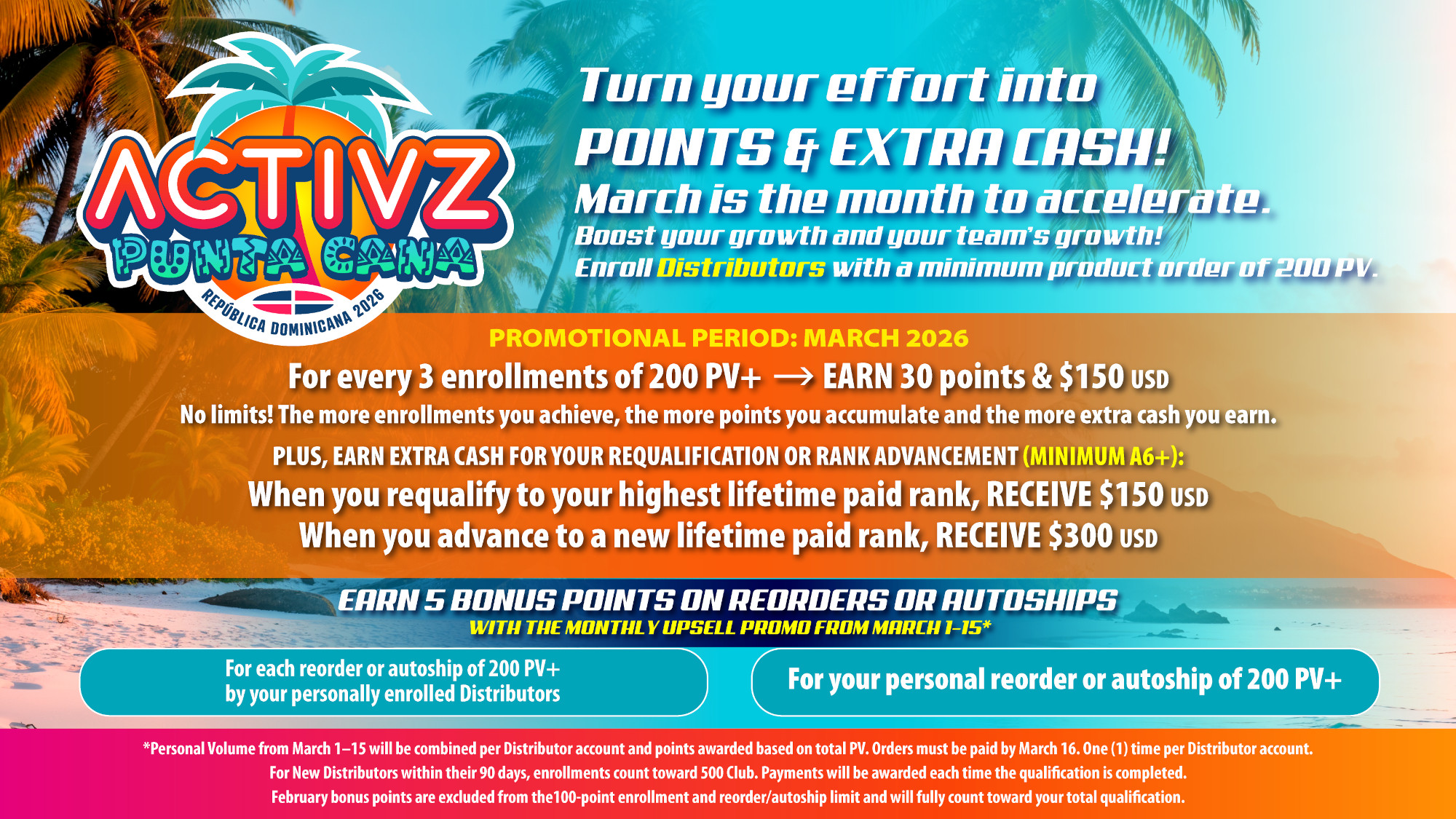 1 point per person per month for autoship or reorder (maximum 100 points possible).